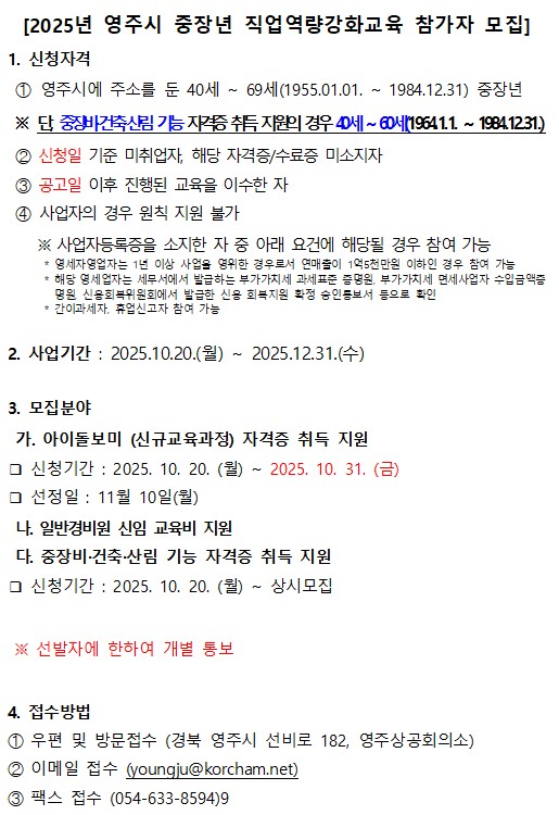 | ‒ | 2025년 영주시 중장년 제2인생 설계학교 운영 (직업역량강화교육) 모집 공고 |