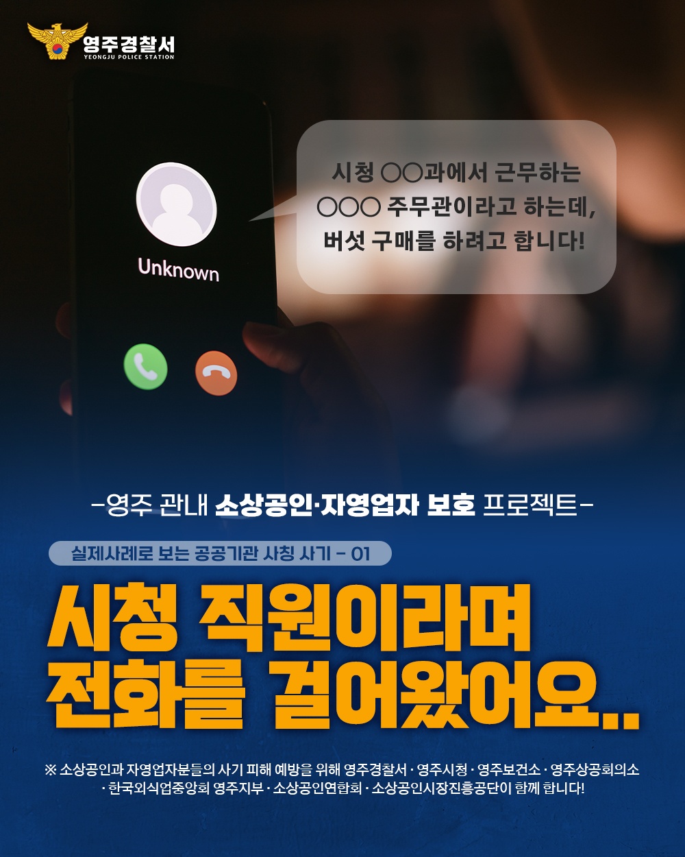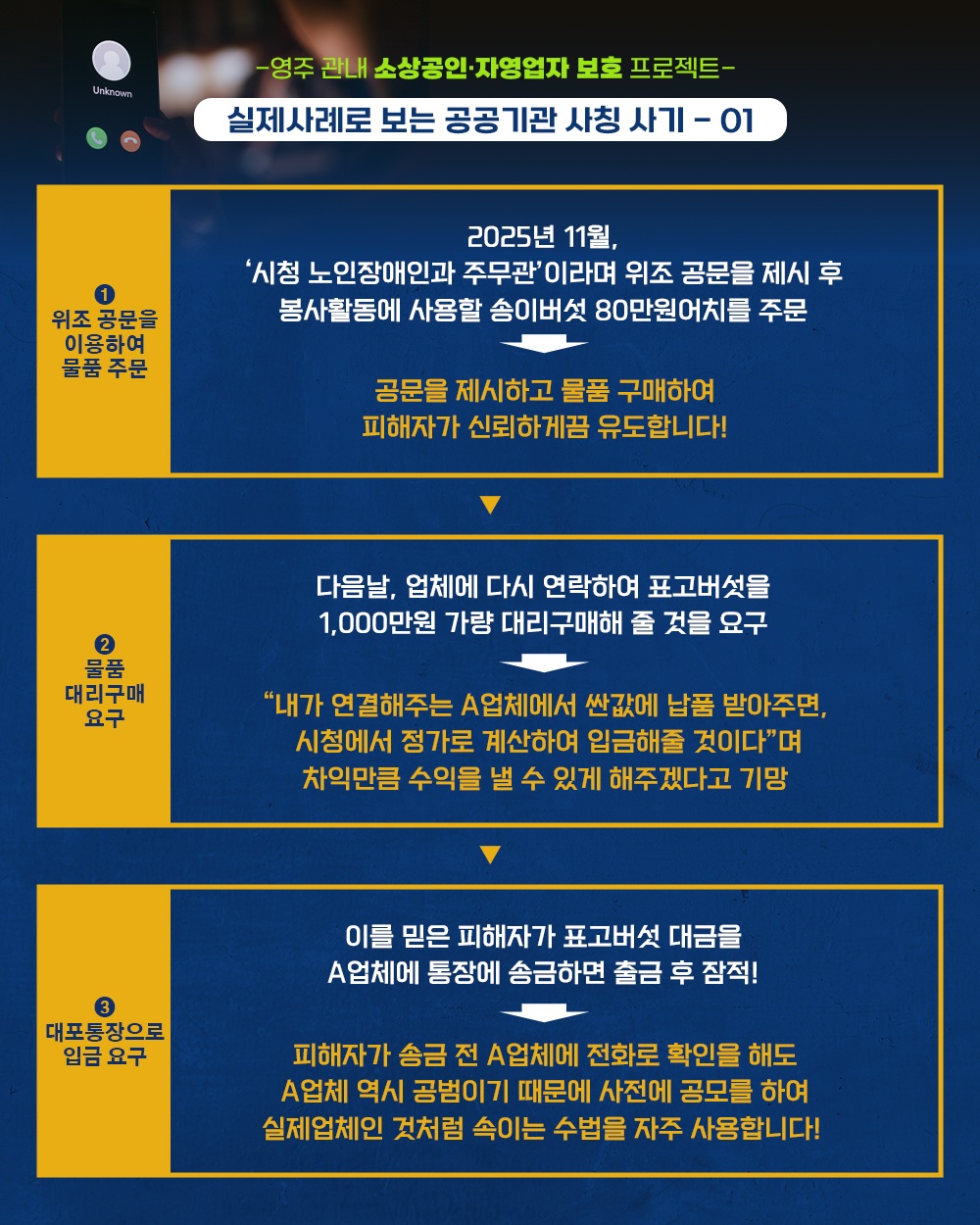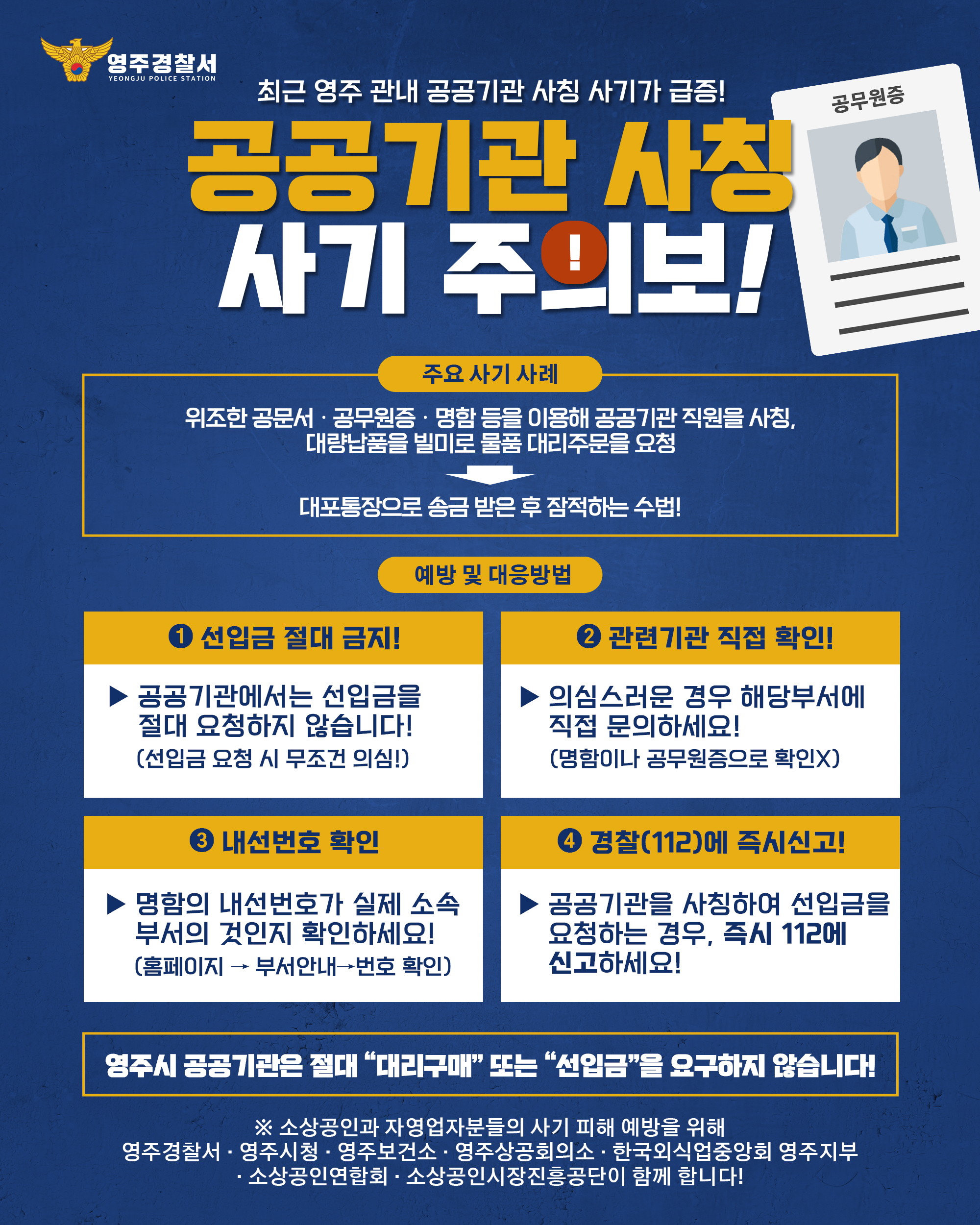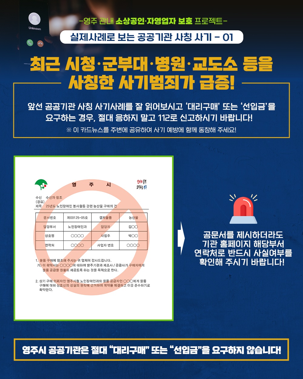 최근 영주 관내 공공기관 사칭 사기가 급증! 영주시 공공기관은 절대 '대리구매' 또는 '선입금'을 요구하지 않습니다!