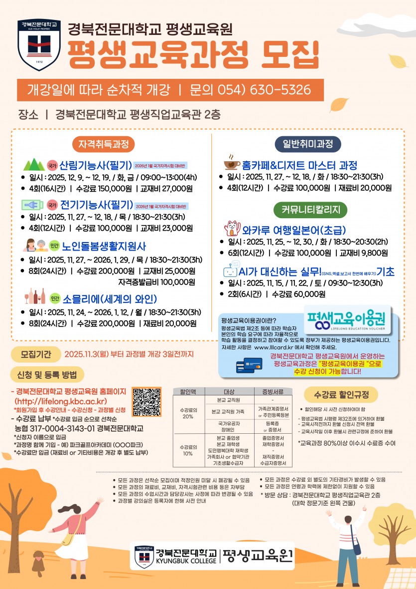 2025년 2학기 경북전문대학교 평생교육과정 수강생 모집 알려드립니다. 많은 관심과 문의를 기다립니다. 문의 : 054) 630-5326