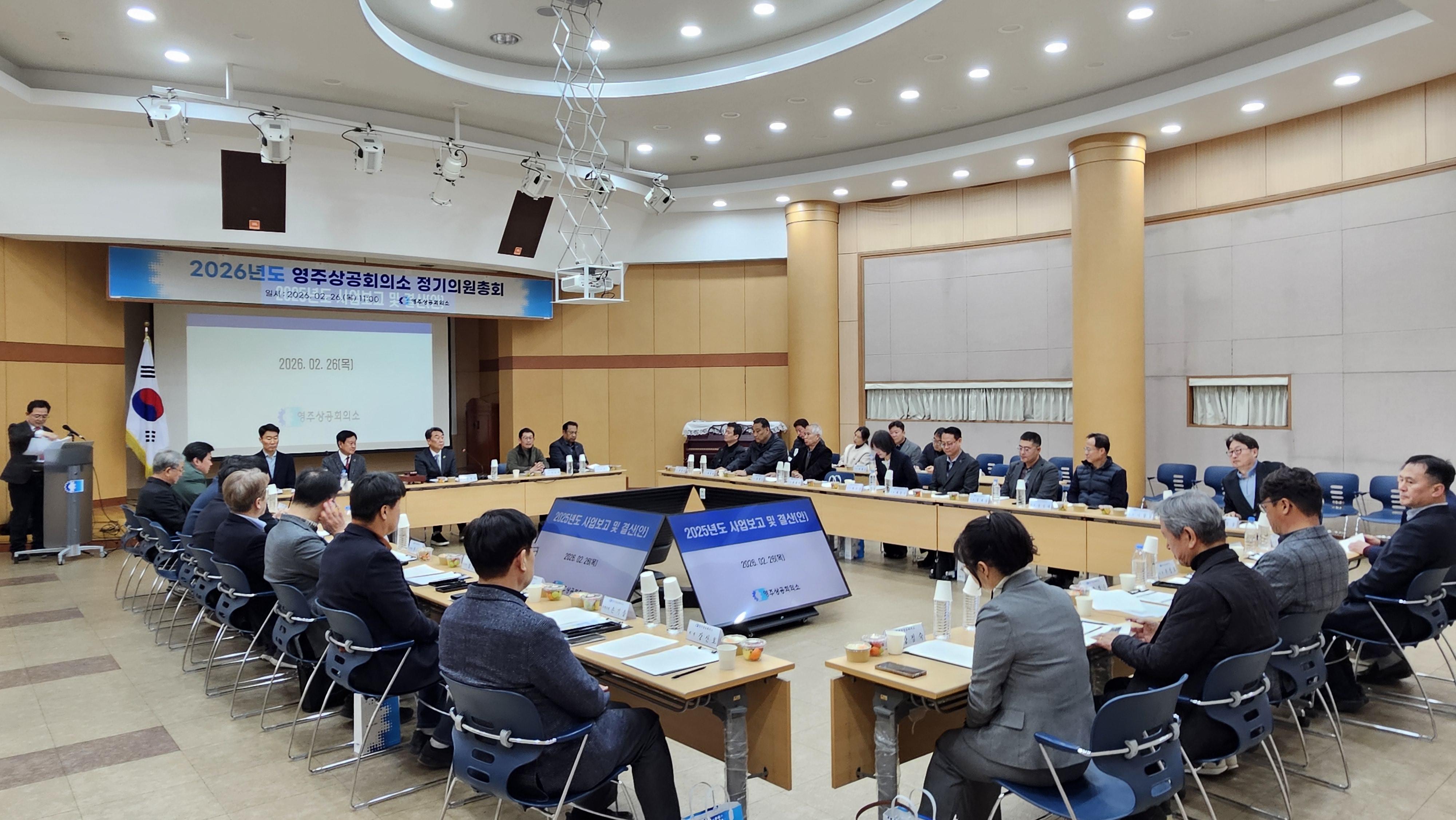 영주상공회의소(회장 정병대)는 2월 26일 대회의실에서 2026년도 정기의원총회를 개최하였다. 총회에 앞서 대구지방고용노동청영주지청에서 2026년 고용노동정책 전반에 대한 설명이 있었고, 이어서 진행된 본회의에서는 의원변동사항보고, 2026년도 사업계획 및 예산에 대한 보고가 있었으며, 2025년도 사업보고 및 결산(안)을 상정하여 원안대로 가결하였다. |